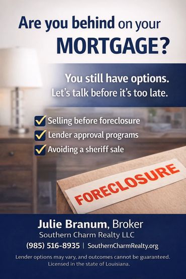 Southern Charm Realty we provide honest, knowledgeable, and client-focused real estate services while helping families, investors, and homeowners navigate buying, selling, and foreclosure challenges with confidence. We are committed to protecting our clients’ best interests and delivering results with integrity across St. Tammany, Washington Parish, and surrounding Louisiana communities.